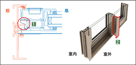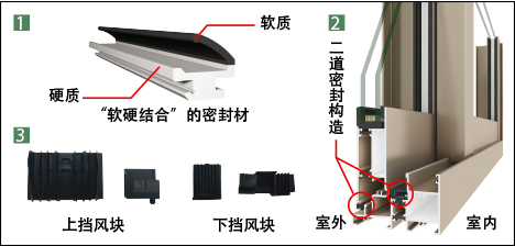 采用软硬兼施的鱼鳍式密封材1,嵌在型材内部的硬质橡胶材有坚固作用,而外部的软质橡胶材能紧贴扇框,保证良好的密封性能。二道密封构造2可有效阻隔污浊空气进入室内,搭配使用安装于推拉门勾启处的特制挡风块3,大大提升气密性能。