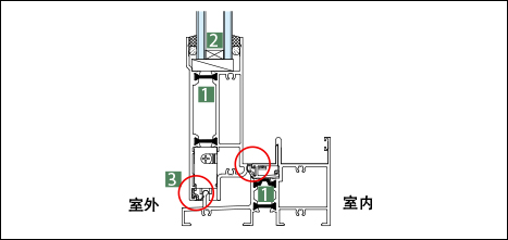 LD100采用14.8mm的隔热条1,阻隔型材传热通道;并可对应双层中空玻璃2,减少透过玻璃的热量传递;二道密封构造3有效降低空气对流造成的热量损失。