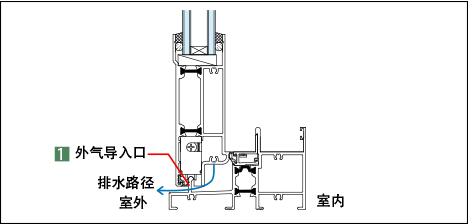 下框处设置外气导入口1,增加导入等压腔的空气,更好地实现等压,增强水密性。框上设有排水口,加快雨水排出。